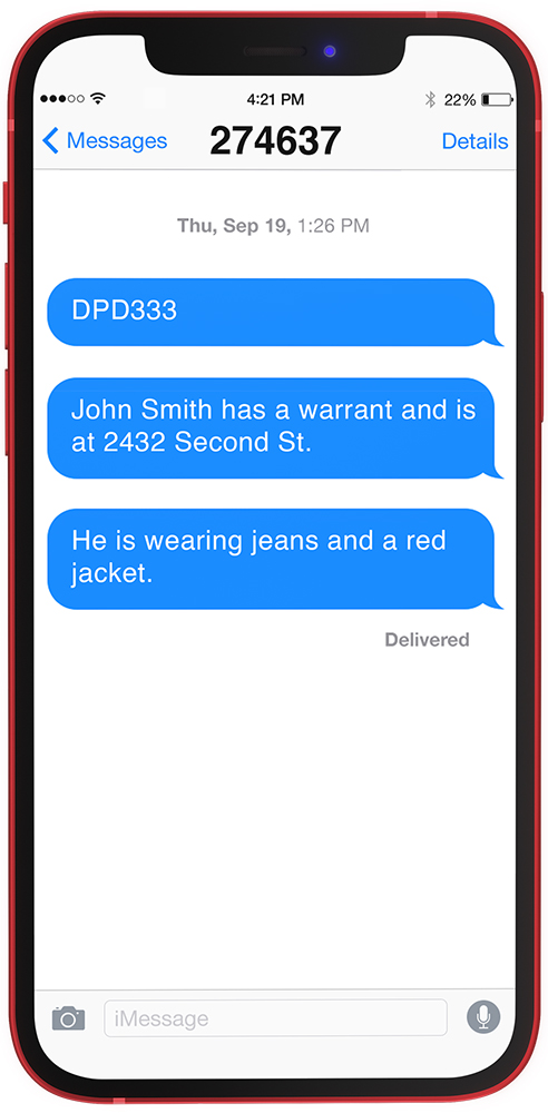 Simply text your tip to 274637 (CRIMES) and type “DPD333” at the beginning of your message followed by your tip information.